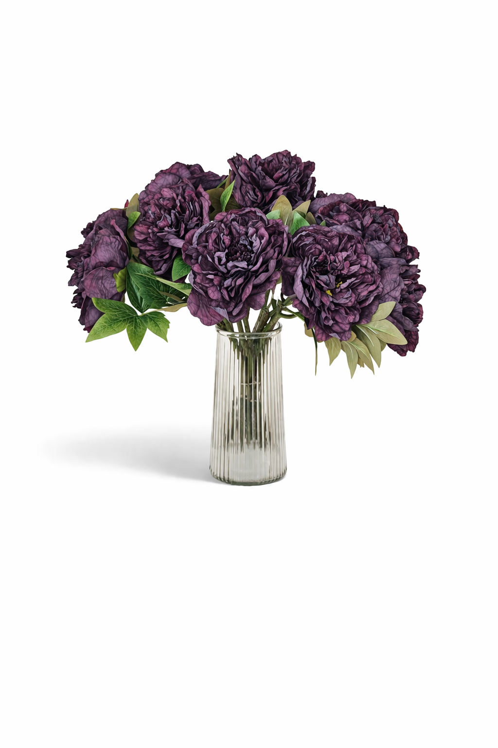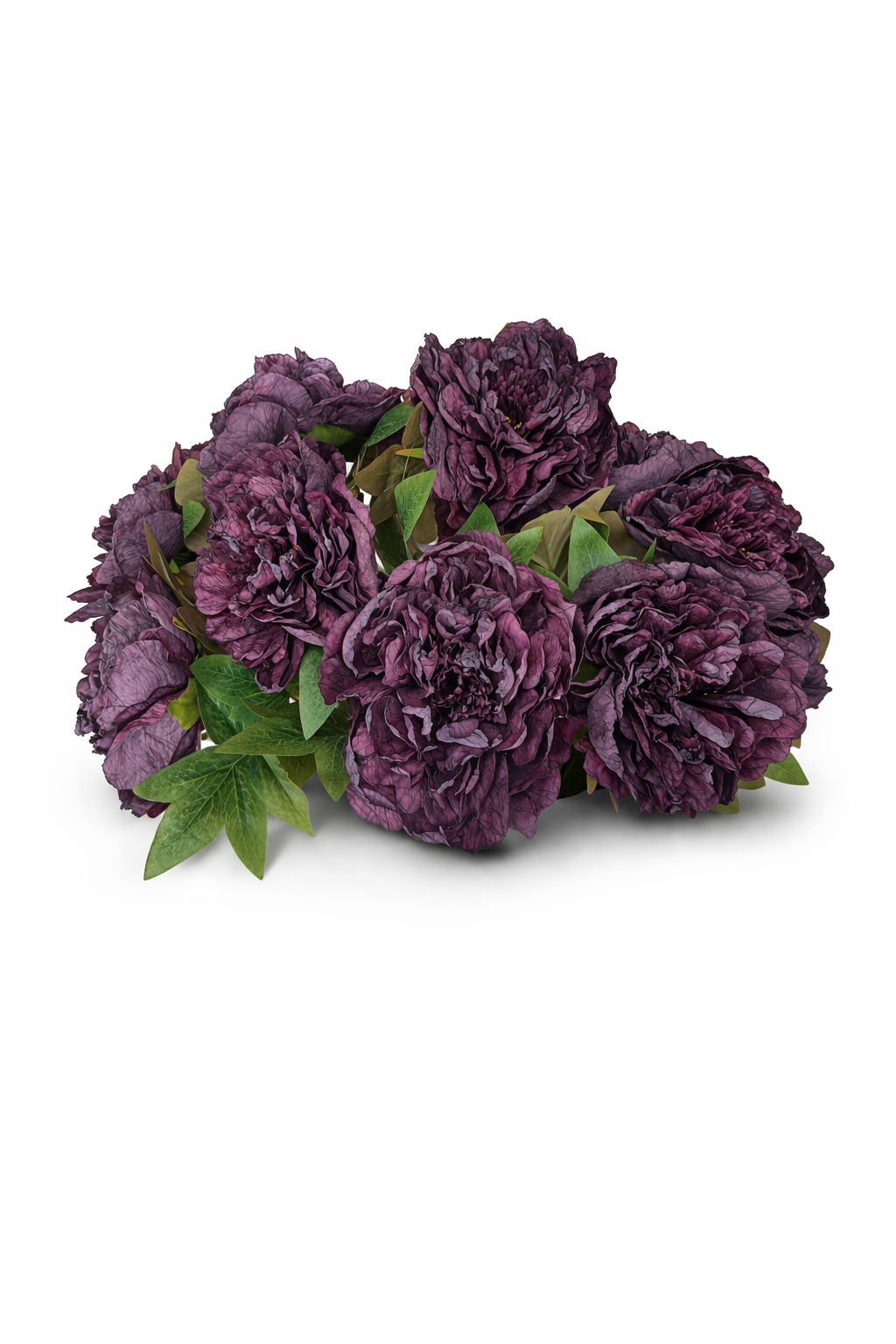 Dekorativ buket med silkepæoner, sammensat i dybe lilla nuancer med grønne blade, som giver et fyldigt og elegant udtryk. De store blomsterhoveder skaber en markant dekoration, der hurtigt tilfører farve og liv til rummet.